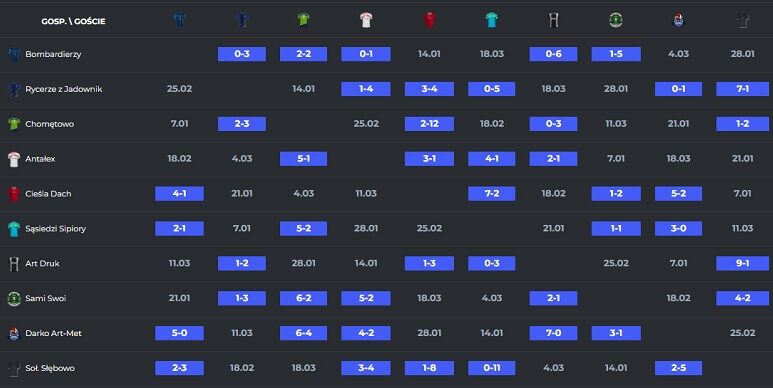 Terminarz II rundy 2026-01-07, 18:30 Chomętowo – Bombardierzy 10 2026-01-07, 19:05 Sąsiedzi Sipiory – Rycerze z Jadownik 10 2026-01-07, 19:40 Antałex – Sami Swoi 10 2026-01-07, 20:15 Art Druk – Darko Art-Met 10 2026-01-07, 20:50 Cieśla Dach – Soł. Słębowo 10 2026-01-14, 18:30 Darko Art-Met – Sąsiedzi Sipiory 11 2026-01-14, 19:05 Rycerze z Jadownik –...... -