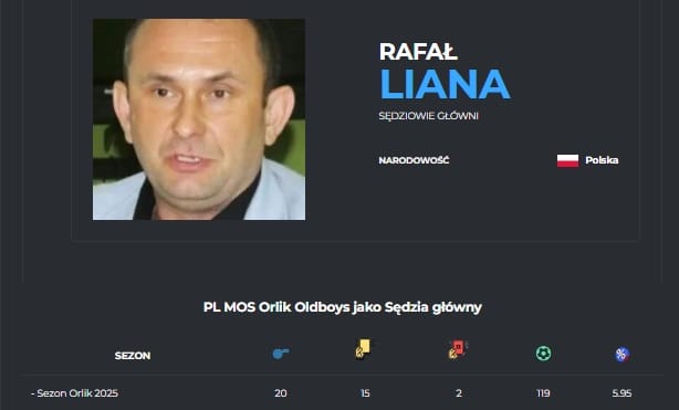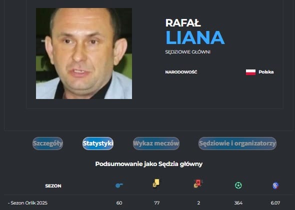 Rafał Liana rozjemcą był w 20 meczach, w których 15 razy sięgał po żółte oraz 2 razy po czerwone kartki. W spotkaniach które sędziował piłkarze strzelili 119 goli.